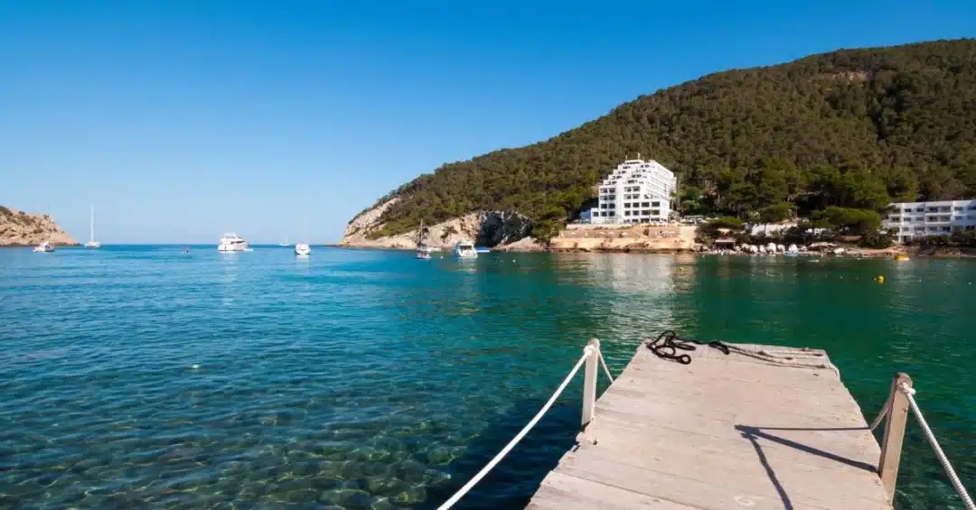 This beach is one of the most popular spots in Ibiza for families with young children, thanks to its safe swimming conditions and extensive facilities.
