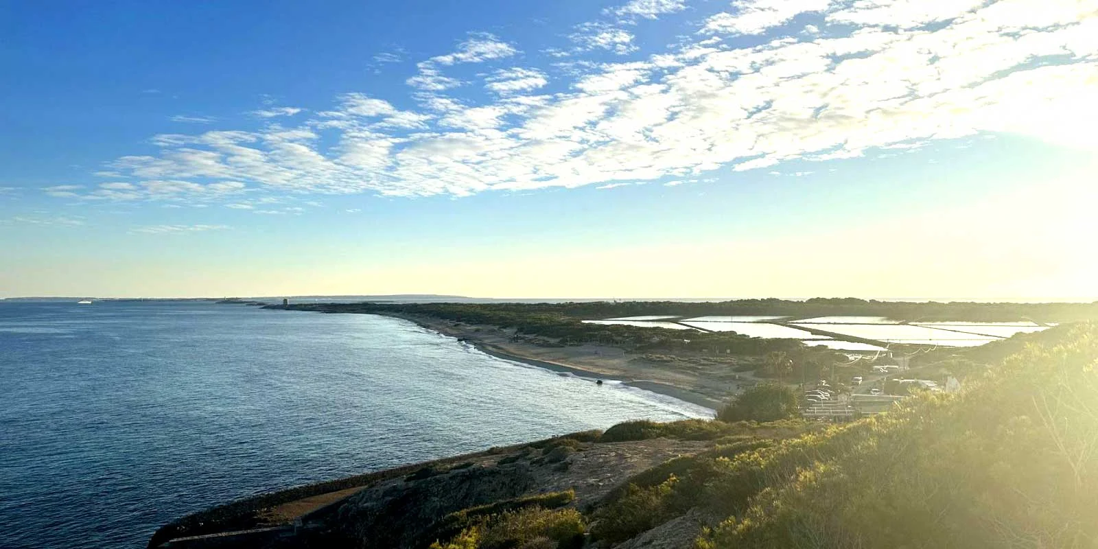 It is nestled within the Ses Salines Natural Park, a protected area known for its ecological significance. It is surrounded by rolling dunes and a lush forest of pine and juniper trees.