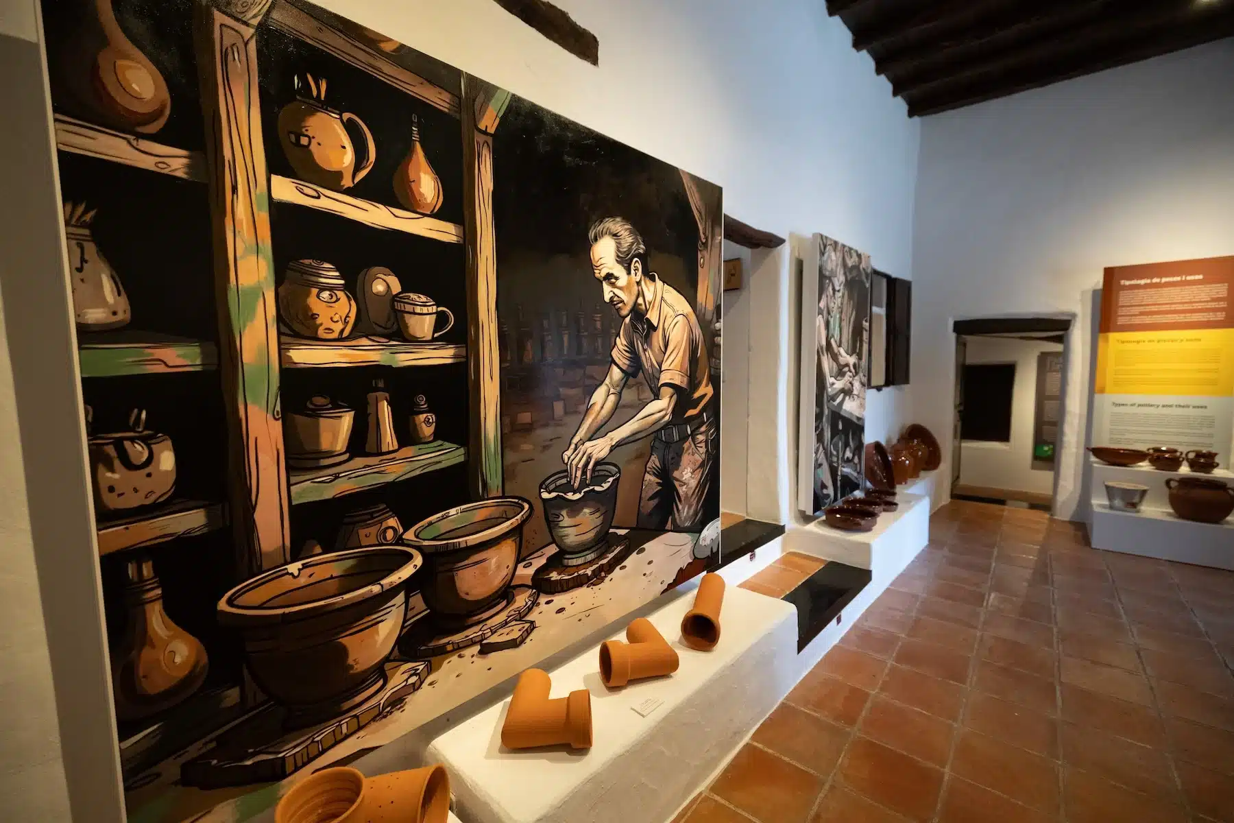 The exhibition includes a collection of handcrafted pottery pieces, along with historical photographs from the Image and Sound Archive of the Ibiza Island Council. Complementing the display are two striking murals created by artists Tito Fernández and Juan Manuel Carrillo (Necko), who have brought a modern, urban-inspired aesthetic to this ancient craft.