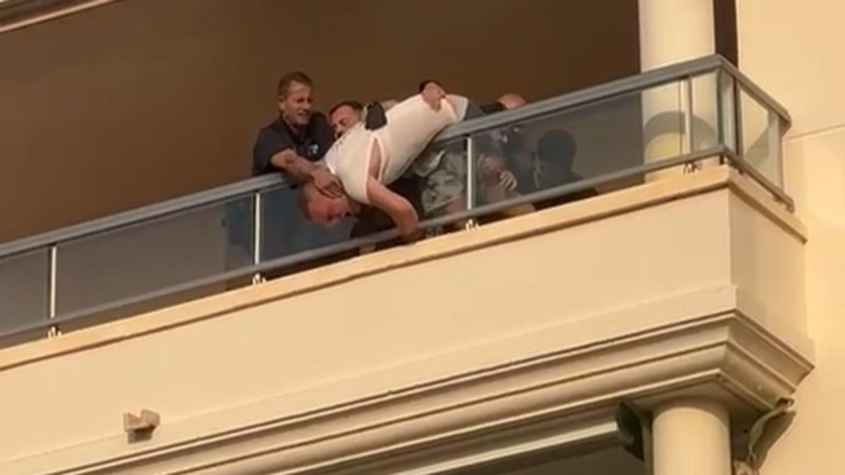 At that moment, the man already had half his body over the railing while several people tried to hold him back. Two police officers, armed with batons, were also attempting to restrain him. The officers and other bystanders were trying to pull the man back onto the terrace; however, he appeared determined to jump. According to eyewitnesses, the man seemed to be under the influence of drugs.