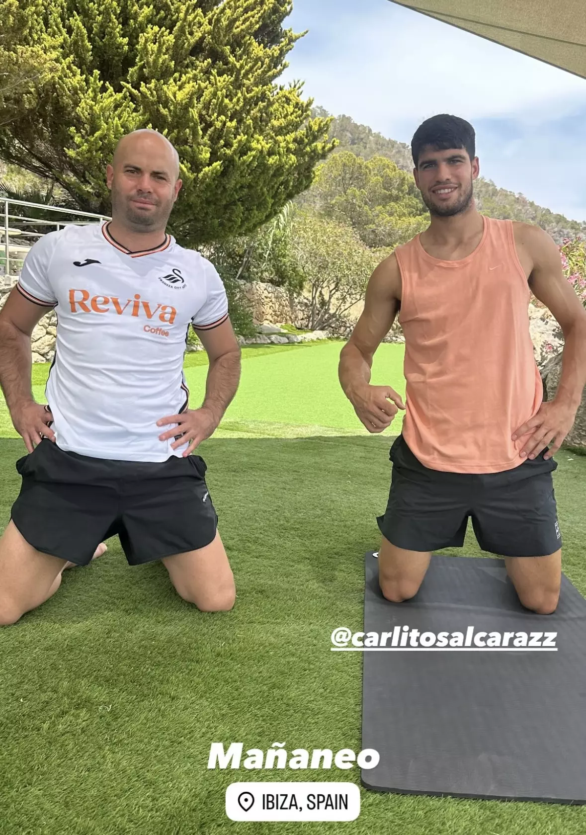 Doing some sport in Ibiza. That’s how it started Carlos Alcaraz , the brand-new winner of Roland Garros, his Tuesday on the island, where he arrived just hours after winning the Musketeers’ Cup in Paris. A session of exercise that he shared with Borja Couce, FIFA agent, who is also in Ibiza and who was the one who shared the image in his Instagram stories. An image that he titled “mañaneo” and in which they are seen on their knees, ready to exercise their bodies outdoors. Couce directly on the grass and Alcaraz, very smiling, on a mat.