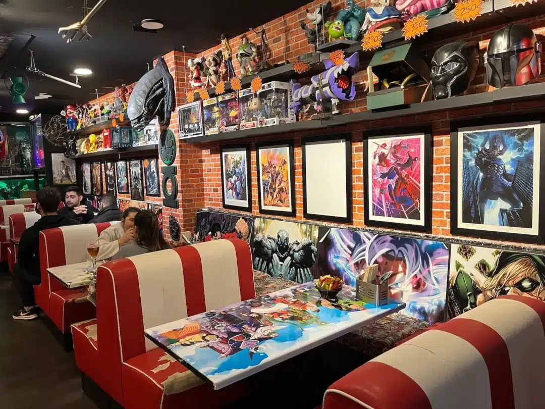 - A fun, nostalgic atmosphere with wall art inspired by anime and comic books.